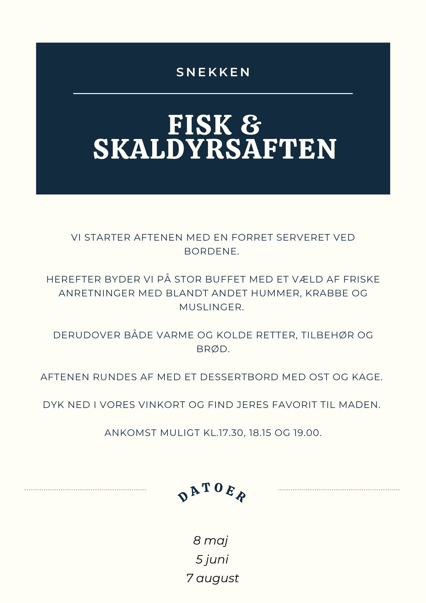 Nyd en overdådig fiske- og skaldyrsbuffet med bl.a. hummer, jomfruhummer, muslinger, krabber, kolde og varme anretninger samt kage & ostebord til dessert.Datoer: