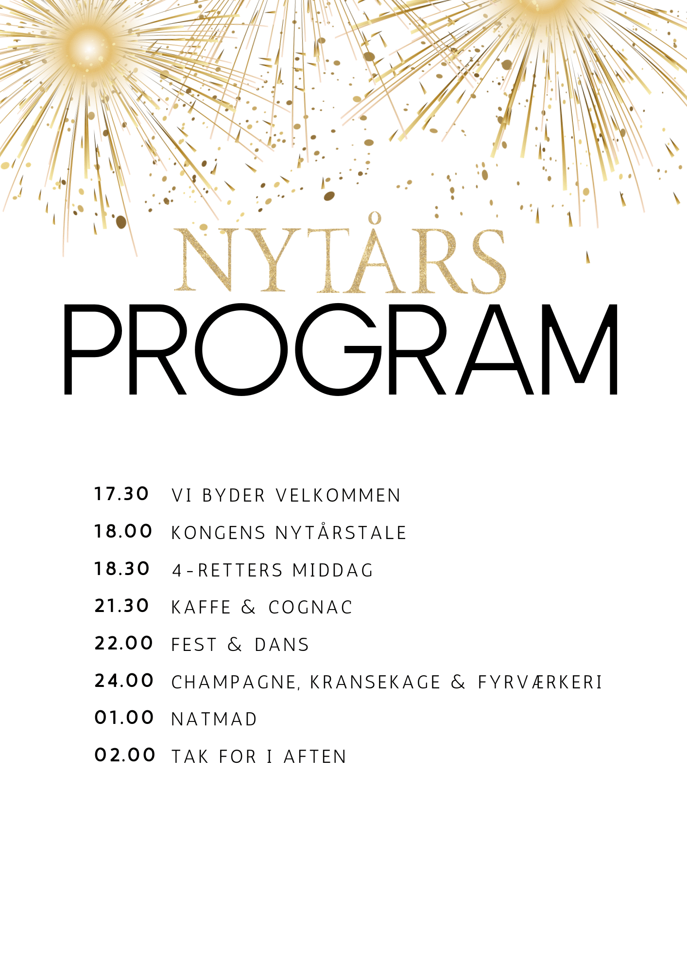 Vi byder på velkomstdrink & snacks, 4-retters middag, fri bar hele aftenen, champagne & kransekage og byens bedste udsigt over fjordens fyrværkeri.